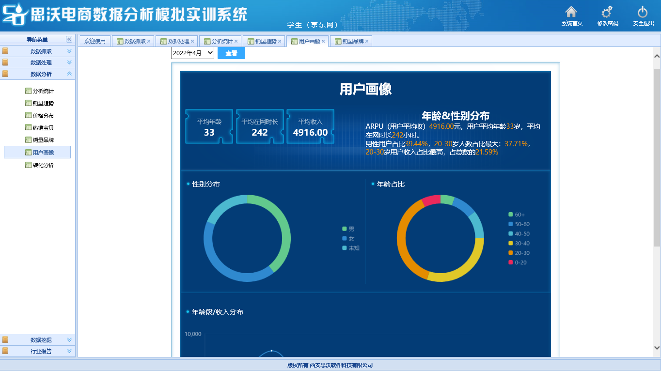 當前大數(shu)(shu)(shu)(shu)據(ju)和(he)(he)(he)數(shu)(shu)(shu)(shu)據(ju)化(hua)運(yun)(yun)(yun)營(ying)(ying)的(de)概念早(zao)已深入人心,數(shu)(shu)(shu)(shu)據(ju)分(fen)(fen)(fen)析(xi)(xi)已經(jing)成為(wei)電(dian)商(shang)從(cong)業(ye)人員不可或(huo)缺的(de)一(yi)項技(ji)能。《思沃電(dian)商(shang)數(shu)(shu)(shu)(shu)據(ju)分(fen)(fen)(fen)析(xi)(xi)模(mo)(mo)(mo)擬(ni)實(shi)訓系(xi)統(tong)(tong)》就是根據(ju)當前電(dian)子(zi)商(shang)務(wu)行業(ye)發展,通過(guo)真實(shi)模(mo)(mo)(mo)擬(ni)電(dian)商(shang)運(yun)(yun)(yun)營(ying)(ying)平臺環(huan)境,幫助學生掌握(wo)電(dian)商(shang)數(shu)(shu)(shu)(shu)據(ju)分(fen)(fen)(fen)析(xi)(xi)技(ji)能的(de)教學平臺軟件(jian)。隨著市場規模(mo)(mo)(mo)的(de)普遍增(zeng)加和(he)(he)(he)業(ye)務(wu)規模(mo)(mo)(mo)的(de)快速增(zeng)長(chang),電(dian)商(shang)業(ye)務(wu)流(liu)程開(kai)始變(bian)得復雜, 涉(she)及的(de)交易數(shu)(shu)(shu)(shu)據(ju)量(liang)將(jiang)繼(ji)續(xu)增(zeng)加。為(wei)了在激烈(lie)的(de)市場競爭(zheng)中(zhong)脫(tuo)穎而出,許多電(dian)商(shang)公司都會設(she)立專(zhuan)門(men)的(de)崗位(wei)和(he)(he)(he)人員,及時了解(jie)廣告、產品價格和(he)(he)(he)銷售數(shu)(shu)(shu)(shu)據(ju),并根據(ju)競爭(zheng)產品 的(de)產品和(he)(he)(he)營(ying)(ying)銷策略進行調整。隨著電(dian)商(shang)領域穩(wen)步(bu)增(zeng)長(chang),競爭(zheng)日(ri)益激烈(lie),渠道精細化(hua)運(yun)(yun)(yun)營(ying)(ying)已然(ran)成為(wei)品牌(pai)突圍(wei)的(de)重(zhong)中(zhong)之重(zhong)。 數(shu)(shu)(shu)(shu)據(ju)(和(he)(he)(he)數(shu)(shu)(shu)(shu)據(ju)分(fen)(fen)(fen)析(xi)(xi))對(dui)電(dian)商(shang)至關重(zhong)要(yao),通過(guo)海量(liang)數(shu)(shu)(shu)(shu)據(ju),店鋪運(yun)(yun)(yun)營(ying)(ying)人員可以了解(jie)客戶的(de)行為(wei)和(he)(he)(he)偏好(hao),也可以洞察同行業(ye)競爭(zheng)對(dui)手的(de)方向和(he)(he)(he)動態(tai),這(zhe)就是了解(jie)自己、了解(jie)競爭(zheng)對(dui)手。 《思沃電(dian)商(shang)數(shu)(shu)(shu)(shu)據(ju)分(fen)(fen)(fen)析(xi)(xi)模(mo)(mo)(mo)擬(ni)實(shi)訓系(xi)統(tong)(tong)》高度模(mo)(mo)(mo)擬(ni)京(jing)(jing)東(dong)網(wang),真實(shi)獲取海量(liang)京(jing)(jing)東(dong)真實(shi)數(shu)(shu)(shu)(shu)據(ju),該教學軟件(jian)系(xi)統(tong)(tong)的(de)從(cong)京(jing)(jing)東(dong)的(de)各(ge)行業(ye)數(shu)(shu)(shu)(shu)據(ju)分(fen)(fen)(fen)析(xi)(xi)入手,系(xi)統(tong)(tong)展示在電(dian)子(zi)商(shang)務(wu)環(huan)境下進行運(yun)(yun)(yun)營(ying)(ying)數(shu)(shu)(shu)(shu)據(ju)分(fen)(fen)(fen)析(xi)(xi)的(de)各(ge)種思路和(he)(he)(he)方法(fa)。 能讓學生快速學會如何(he)做電(dian)商(shang)數(shu)(shu)(shu)(shu)據(ju)分(fen)(fen)(fen)析(xi)(xi),并能利(li)用數(shu)(shu)(shu)(shu)據(ju)分(fen)(fen)(fen)析(xi)(xi)結果指導網(wang)店經(jing)營(ying)(ying)。