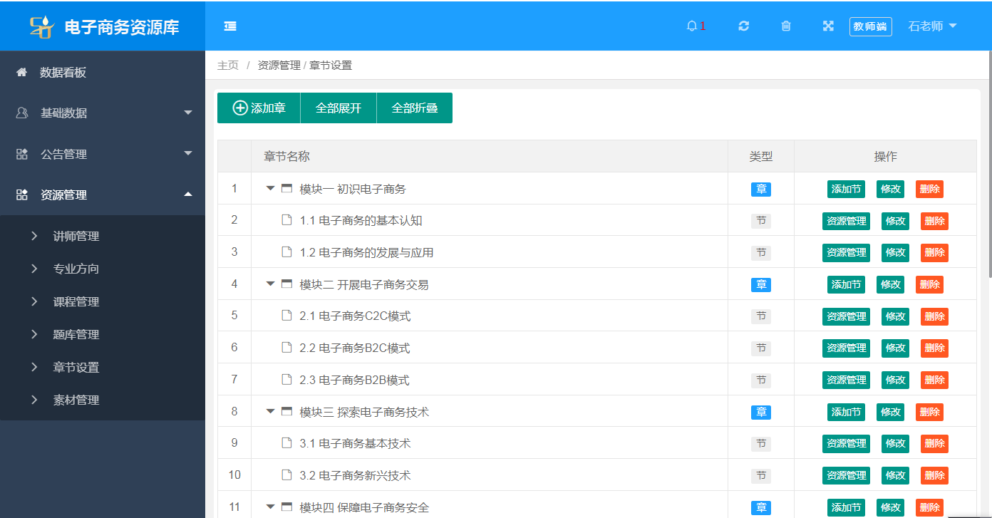 教師(shi)端的(de)基礎(chu)數據(ju)(ju)包(bao)括(kuo)數據(ju)(ju)看板,基礎(chu)數據(ju)(ju),公告管理(li),資(zi)源管理(li)。數據(ju)(ju)統(tong)計包(bao)括(kuo)班級(ji)統(tong)計,學生統(tong)計,專業方(fang)向,課程統(tong)計,講師(shi)統(tong)計,素材統(tong)計,報表統(tong)計等。