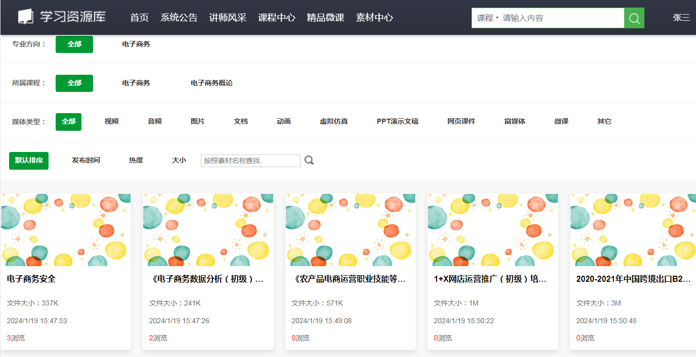 電子商務資(zi)源(yuan)庫平臺分為前臺學生(sheng)用戶(hu)和后(hou)臺管理員、教(jiao)(jiao)師用戶(hu)。前臺學生(sheng)用戶(hu)進入(ru)所(suo)屬專(zhuan)業課程學習,檢索、下載(zai)、預覽、在線互動、在線提問、交流等(deng)操作。支持(chi)資(zi)源(yuan)推(tui)(tui)(tui)送(song)、消息(xi)推(tui)(tui)(tui)送(song)、學習進度推(tui)(tui)(tui)送(song)等(deng)。后(hou)臺教(jiao)(jiao)師可進行(xing)公告、課程、章(zhang)節、題庫、素材等(deng)資(zi)源(yuan)維護(hu)、管理、教(jiao)(jiao)學及(ji)數據看板(ban)統計等(deng)基本功能,體現以用戶(hu)為中(zhong)心(xin)的服務理念,支持(chi)個(ge)性化學習和個(ge)性化教(jiao)(jiao)學。
