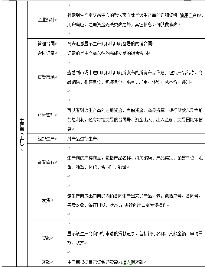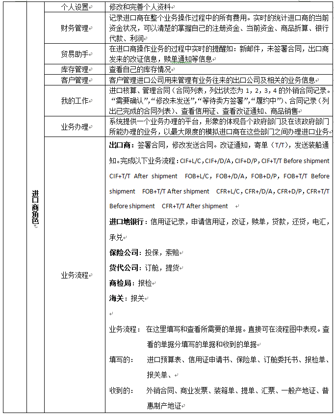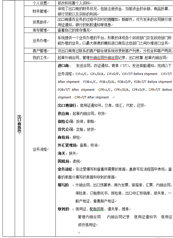 7、可以配(pei)置進(jin)口商(shang)(shang)、出(chu)口商(shang)(shang)、進(jin)口地銀行(xing)、出(chu)口地銀行(xing)、國稅局(ju)(ju)、海(hai)關(guan)、商(shang)(shang)檢局(ju)(ju)、保險公司、貨代公司、外(wai)匯管(guan)理局(ju)(ju)等相關(guan)參數和業務,在實訓過程中可以分組、分角(jiao)(jiao)色(se)進(jin)行(xing)互動、交互式訓練。角(jiao)(jiao)色(se)扮演:出(chu)口商(shang)(shang)、進(jin)口商(shang)(shang)、生產商(shang)(shang)(工(gong)廠)、進(jin)口銀行(xing)、出(chu)口銀行(xing)、保險公司、商(shang)(shang)檢局(ju)(ju)、海(hai)關(guan)、外(wai)匯管(guan)理局(ju)(ju)、貨代、國稅局(ju)(ju)
