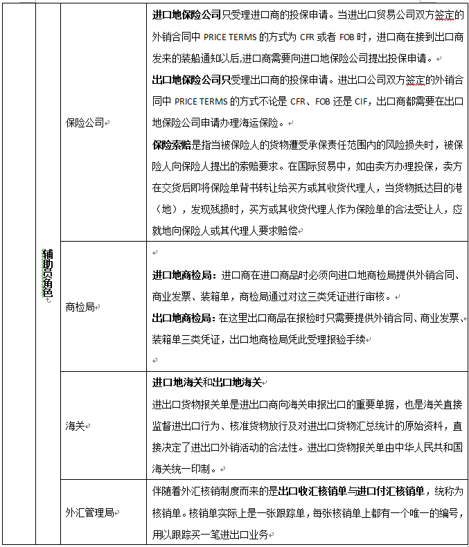 出(chu)口(kou)商、進口(kou)商、生產商(工廠(chang))、進口(kou)銀行、出(chu)口(kou)銀行、保(bao)險(xian)公司、商檢局(ju)、海(hai)關、外匯管理局(ju)、貨代、國稅局(ju)