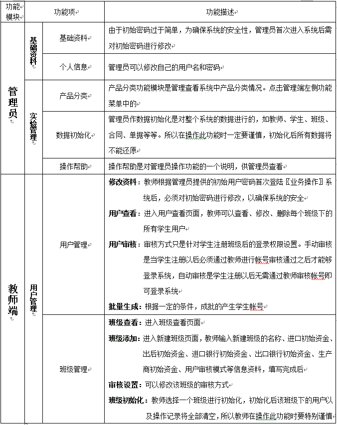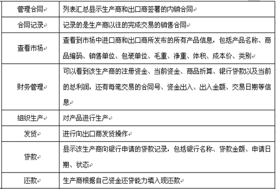 教(jiao)師為參加實習的(de)學(xue)生(sheng)(sheng)分(fen)配(pei)角色,設(she)定實習評(ping)分(fen)標(biao)準(zhun)、實時監控學(xue)生(sheng)(sheng)的(de)操作,并且對(dui)(dui)于(yu)模(mo)擬貿(mao)易中(zhong)發生(sheng)(sheng)的(de)糾紛進(jin)行仲裁,最終利(li)用(yong)評(ping)分(fen)系(xi)統對(dui)(dui)學(xue)生(sheng)(sheng)的(de)實習成(cheng)果給予評(ping)定,教(jiao)師通過(guo)在(zai)網站(zhan)發布新聞、調(diao)整(zheng)商品成(cheng)本和價格(ge)、調(diao)整(zheng)匯率、業(ye)務費用(yong)、海運(yun)費、保險(xian)費率及突發事件的(de)發生(sheng)(sheng)概率等方式對(dui)(dui)國際貿(mao)易環境實施(shi)宏觀(guan)調(diao)控,讓學(xue)生(sheng)(sheng)在(zai)實習中(zhong)充分(fen)發揮主觀(guan)能(neng)動性(xing)