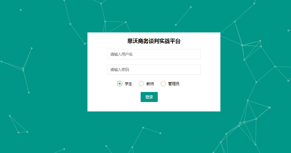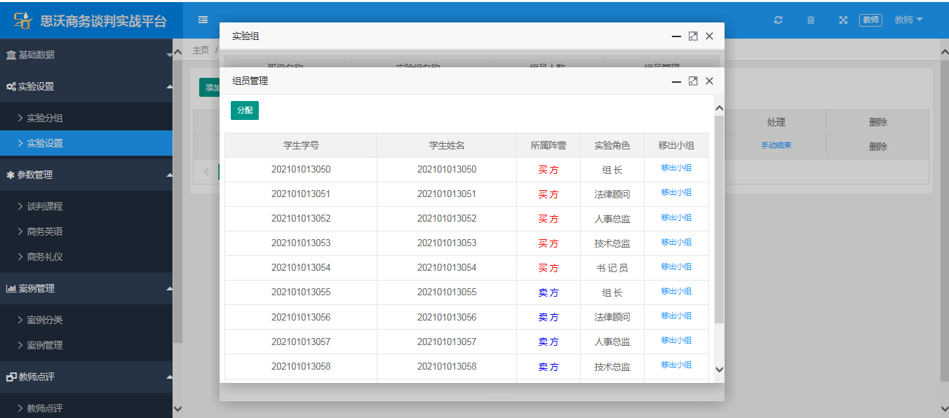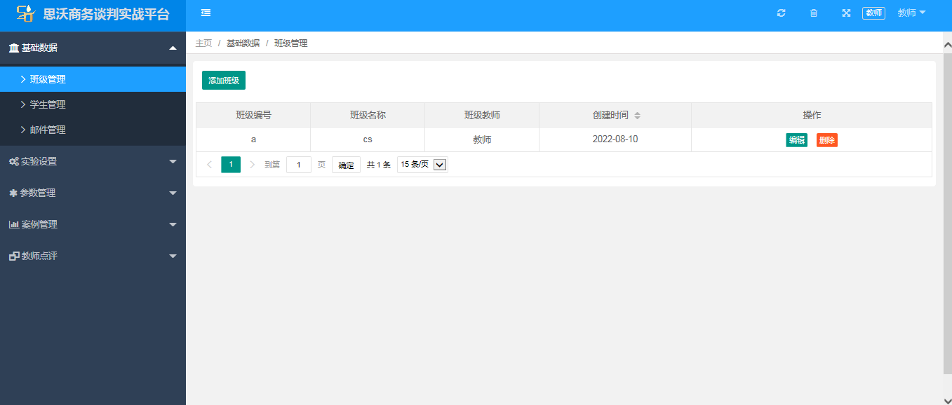 教師(shi)端包(bao)括:基礎數(shu)(shu)據(班級管(guan)(guan)(guan)理、學生(sheng)管(guan)(guan)(guan)理、郵件管(guan)(guan)(guan)理);實(shi)(shi)驗(yan)設置(zhi)(實(shi)(shi)驗(yan)分組、實(shi)(shi)驗(yan)設置(zhi));參(can)數(shu)(shu)管(guan)(guan)(guan)理(談判課程(cheng)、商(shang)務(wu)英語、商(shang)務(wu)禮儀);案(an)例(li)(li)管(guan)(guan)(guan)理(案(an)例(li)(li)分類、案(an)例(li)(li)管(guan)(guan)(guan)理);教師(shi)點評(ping)(教師(shi)點評(ping)、教師(shi)點評(ping)庫、視頻回放、談判得(de)分)。