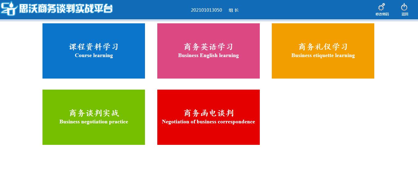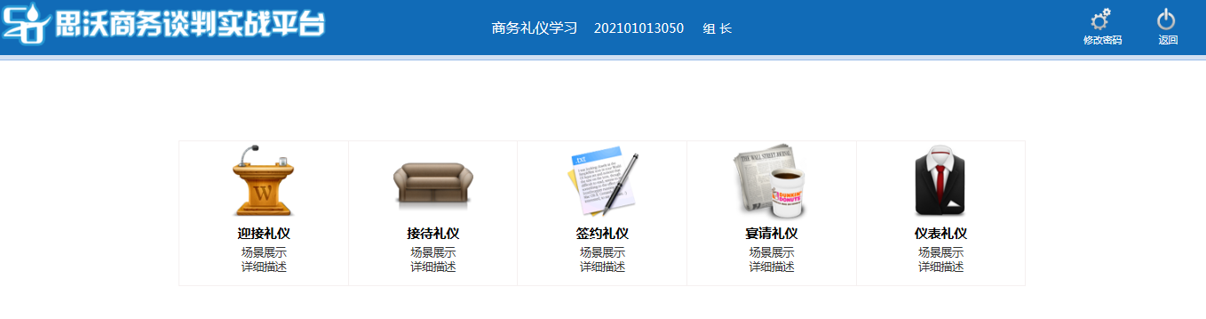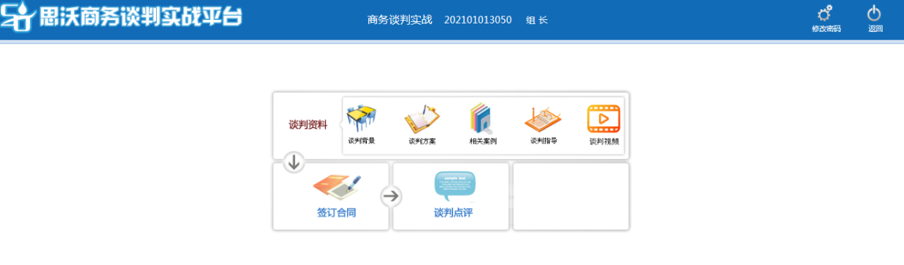 思(si)沃國(guo)際商(shang)務(wu)談(tan)判實(shi)訓平臺系統采用了(le)源于國(guo)外知名商(shang)學院的商(shang)務(wu)談(tan)判經(jing)典案例素材,結合近(jin)10年來(lai)應用于中國(guo)學生(sheng)的教學實(shi)踐(jian)經(jing)驗加(jia)以修訂和(he)完(wan)善(shan),形成(cheng)了(le)與教學課件內容和(he)進程相配合的7個模擬談(tan)判實(shi)踐(jian)單元。