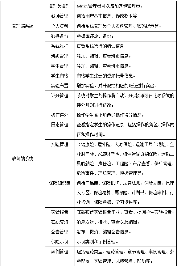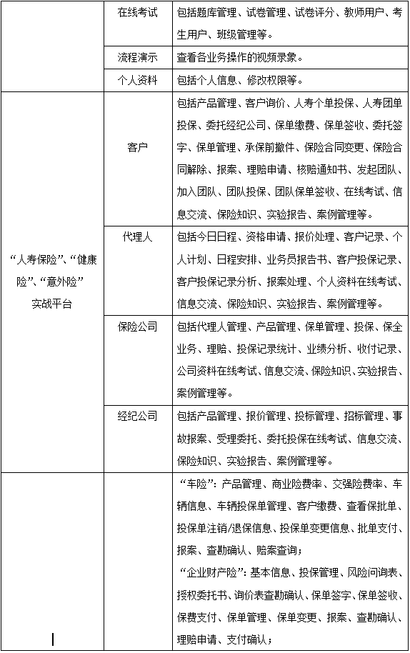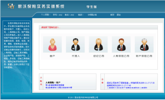 學生通過飾演保(bao)(bao)(bao)(bao)險(xian)(xian)(xian)(xian)業務流程中(zhong)(zhong)的(de)客戶、代(dai)理人(ren)、經(jing)紀公(gong)司、人(ren)壽保(bao)(bao)(bao)(bao)險(xian)(xian)(xian)(xian)公(gong)司、財(cai)產(chan)(chan)保(bao)(bao)(bao)(bao)險(xian)(xian)(xian)(xian)公(gong)司五種角色(se),進入“人(ren)壽保(bao)(bao)(bao)(bao)險(xian)(xian)(xian)(xian)”和“財(cai)產(chan)(chan)保(bao)(bao)(bao)(bao)險(xian)(xian)(xian)(xian)”實踐平臺,從(cong)展業投保(bao)(bao)(bao)(bao)環(huan)節開始,至索賠(pei)(pei)(pei)理賠(pei)(pei)(pei)為(wei)止,全面操練保(bao)(bao)(bao)(bao)險(xian)(xian)(xian)(xian)核(he)心業務中(zhong)(zhong)的(de)投保(bao)(bao)(bao)(bao)、承(cheng)保(bao)(bao)(bao)(bao)、核(he)保(bao)(bao)(bao)(bao)、變更、理賠(pei)(pei)(pei)、核(he)賠(pei)(pei)(pei)等流程,使學生的(de)知識(shi)結(jie)構提升,彌補實踐業務操作(zuo)的(de)缺(que)乏(fa),實現對(dui)人(ren)壽保(bao)(bao)(bao)(bao)險(xian)(xian)(xian)(xian)、運(yun)輸工(gong)具車輛險(xian)(xian)(xian)(xian)、企業財(cai)產(chan)(chan)險(xian)(xian)(xian)(xian)、家庭財(cai)產(chan)(chan)險(xian)(xian)(xian)(xian)、海洋(yang)運(yun)輸貨(huo)物(wu)保(bao)(bao)(bao)(bao)險(xian)(xian)(xian)(xian)、運(yun)輸工(gong)具船舶(bo)險(xian)(xian)(xian)(xian)、責任險(xian)(xian)(xian)(xian)、工(gong)程險(xian)(xian)(xian)(xian)的(de)熟悉、掌握,對(dui)保(bao)(bao)(bao)(bao)險(xian)(xian)(xian)(xian)業務的(de)主要工(gong)作(zuo)流程有一個清晰的(de)輪(lun)廓(kuo),為(wei)學以致用打下堅固的(de)基礎。