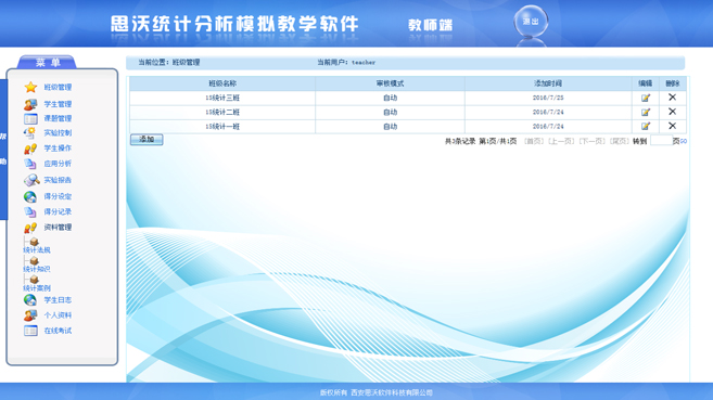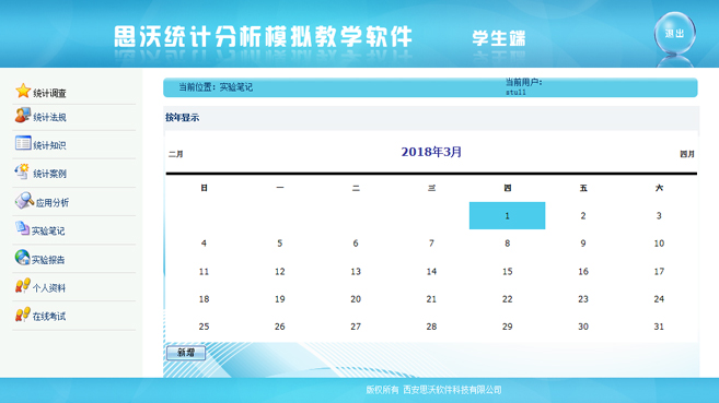 【學生端功能】:統(tong)計調查、統(tong)計法(fa)規、統(tong)計知識(shi)、統(tong)計案(an)例、應(ying)用(yong)分析、實驗筆記、實驗報告、個(ge)人資料、在線(xian)考(kao)試(shi)、幫助、退出系統(tong)。