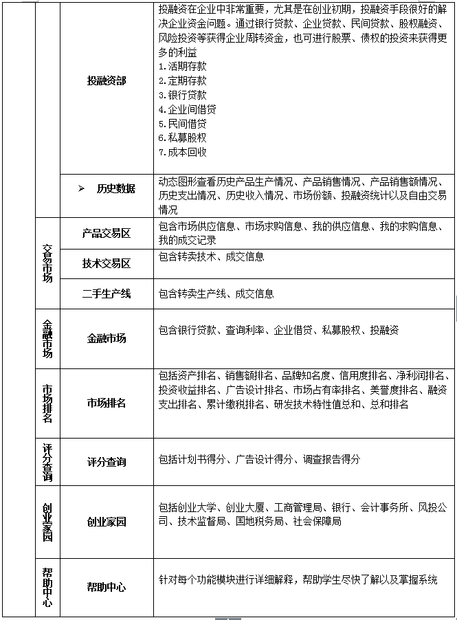 4、企業(ye)(ye)(ye)投融資(zi)(zi)(zi)管理:系(xi)統必須含(han)有投融資(zi)(zi)(zi)模(mo)塊,了解操(cao)作企業(ye)(ye)(ye)的基(ji)本投資(zi)(zi)(zi)和(he)融資(zi)(zi)(zi)手段,模(mo)塊包括:銀行(xing)存款(kuan)、銀行(xing)貸款(kuan)、企業(ye)(ye)(ye)間借(jie)貸、民間借(jie)貸、私幕(mu)股權。另(ling)外還含(han)有風(feng)險(xian)投資(zi)(zi)(zi)模(mo)塊,在審核計劃書后做出評價和(he)評分,由教師設(she)置是否給予(yu)風(feng)險(xian)投資(zi)(zi)(zi),以及(ji)金額。設(she)置后系(xi)統自動(dong)給相應企業(ye)(ye)(ye)發送反饋信(xin)息,接受并給予(yu)風(feng)投的企業(ye)(ye)(ye)前來簽(qian)訂風(feng)投協(xie)議領(ling)取風(feng)投資(zi)(zi)(zi)金