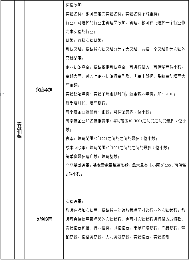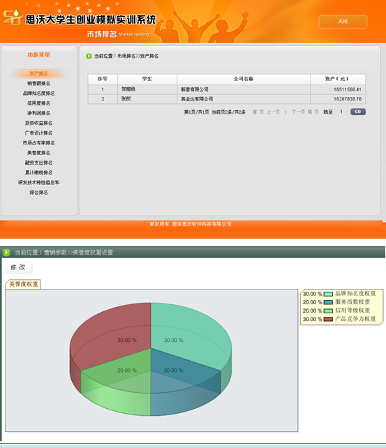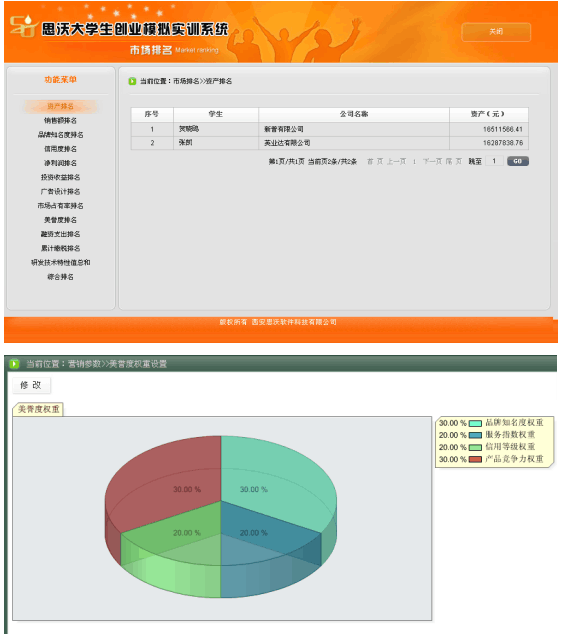 5、系(xi)統具有自動(dong)計分(fen)和手(shou)動(dong)評(ping)分(fen)功能。自動(dong)計分(fen)以各方(fang)面排(pai)(pai)名(ming)(ming)(ming)的形式,包(bao)括資金排(pai)(pai)名(ming)(ming)(ming)、銷售排(pai)(pai)名(ming)(ming)(ming)、知名(ming)(ming)(ming)度(du)排(pai)(pai)名(ming)(ming)(ming)、利潤排(pai)(pai)名(ming)(ming)(ming)、投資收益排(pai)(pai)名(ming)(ming)(ming)、廣告設(she)(she)計排(pai)(pai)名(ming)(ming)(ming)、市場占有率排(pai)(pai)名(ming)(ming)(ming)、美(mei)譽度(du)排(pai)(pai)名(ming)(ming)(ming)、投融資收益排(pai)(pai)名(ming)(ming)(ming)、累計繳稅排(pai)(pai)名(ming)(ming)(ming)、綜合排(pai)(pai)名(ming)(ming)(ming)等。教師可以批(pi)閱學生所提(ti)交的計劃(hua)書、廣告設(she)(she)計、市場調(diao)查分(fen)析、公司制度(du)等。