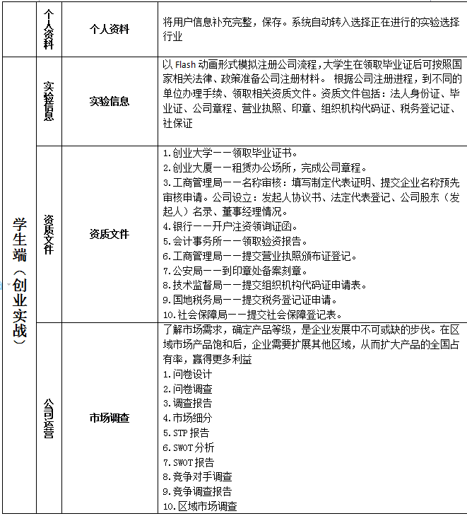 學生(sheng)端模擬現實創(chuang)業的(de)步驟及相關(guan)流程進行創(chuang)業實驗。