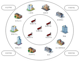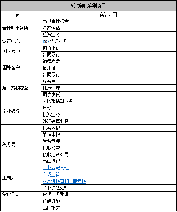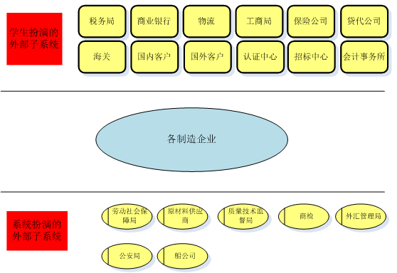 跨(kua)專業(ye)(ye)平臺主要由搭(da)建平臺運行(xing)(xing)(xing)(xing)環境(jing)、制(zhi)造(zao)(zao)(zao)企業(ye)(ye)運營、行(xing)(xing)(xing)(xing)政業(ye)(ye)務(wu)(wu)(wu)和(he)金融(rong)業(ye)(ye)務(wu)(wu)(wu)等(deng)幾大(da)部(bu)(bu)(bu)(bu)分組成(cheng)。以現代(dai)制(zhi)造(zao)(zao)(zao)行(xing)(xing)(xing)(xing)業(ye)(ye)為藍本,設(she)置總經(jing)理辦(ban)公(gong)室、銷售部(bu)(bu)(bu)(bu)、生(sheng)產部(bu)(bu)(bu)(bu)、采購部(bu)(bu)(bu)(bu)、倉儲部(bu)(bu)(bu)(bu)、外(wai)貿部(bu)(bu)(bu)(bu)、市(shi)場(chang)部(bu)(bu)(bu)(bu)、財務(wu)(wu)(wu)部(bu)(bu)(bu)(bu)、人才資源(yuan)部(bu)(bu)(bu)(bu)、企業(ye)(ye)投(tou)資融(rong)部(bu)(bu)(bu)(bu)等(deng)十(shi)大(da)制(zhi)造(zao)(zao)(zao)企業(ye)(ye)職能部(bu)(bu)(bu)(bu)門;真實模擬行(xing)(xing)(xing)(xing)政辦(ban)事部(bu)(bu)(bu)(bu)門,提(ti)供工商局(ju)、稅(shui)務(wu)(wu)(wu)局(ju)、會(hui)(hui)計(ji)事務(wu)(wu)(wu)所、銀行(xing)(xing)(xing)(xing)、物流(liu)、保險公(gong)司、貸代(dai)公(gong)司等(deng)辦(ban)事場(chang)所;系統(tong)虛擬扮演公(gong)安局(ju)、質量與技術監督局(ju)、勞動與社會(hui)(hui)保障局(ju)、原材料供應商、海關、商檢、外(wai)匯管(guan)理局(ju)、船公(gong)司等(deng)服務(wu)(wu)(wu)性(xing)(xing)部(bu)(bu)(bu)(bu)門行(xing)(xing)(xing)(xing)業(ye)(ye)。攘括(kuo)了與制(zhi)造(zao)(zao)(zao)行(xing)(xing)(xing)(xing)業(ye)(ye)有(you)關的(de)所有(you)相關行(xing)(xing)(xing)(xing)政辦(ban)事部(bu)(bu)(bu)(bu)門和(he)服務(wu)(wu)(wu)性(xing)(xing)行(xing)(xing)(xing)(xing)業(ye)(ye)。